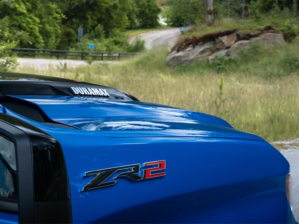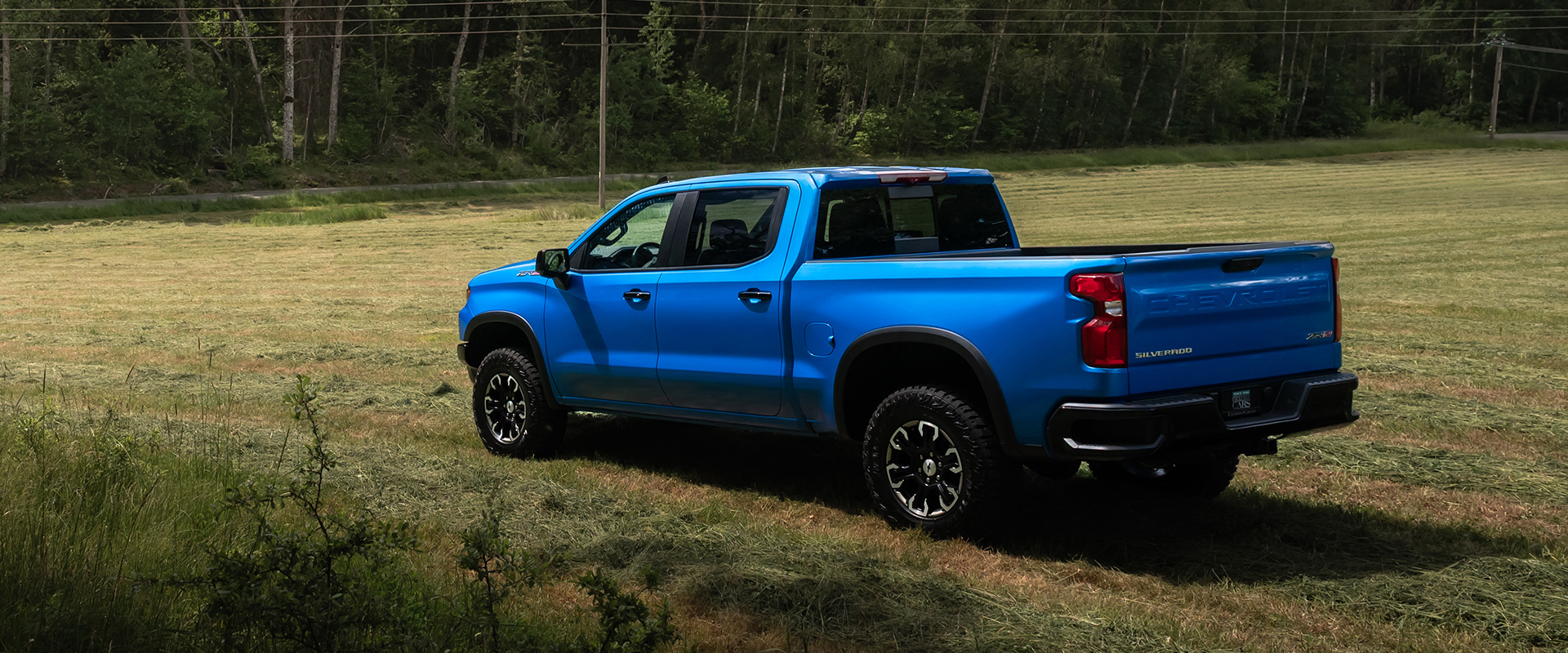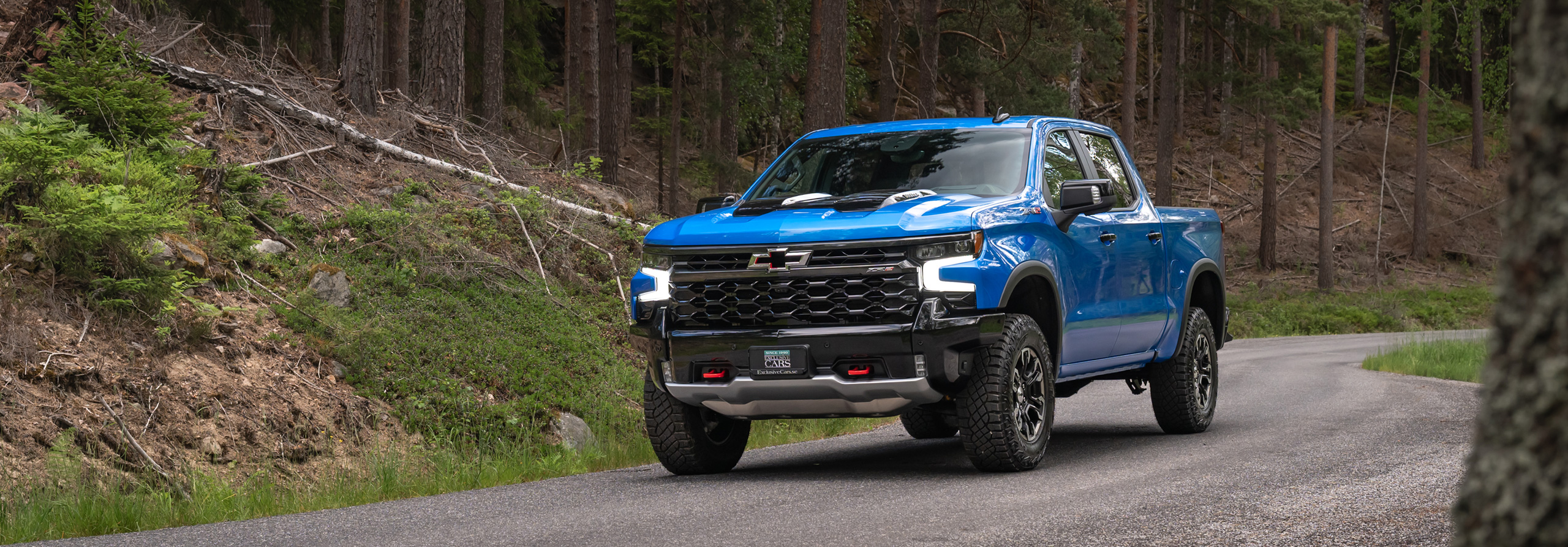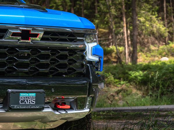När vägen inte längre räcker till är det Silverado ZR2 som gäller – En offroadfokuserad modell med fabrikshöjning, offroadstötfångare och stora hasplåtar i aluminium undertill.